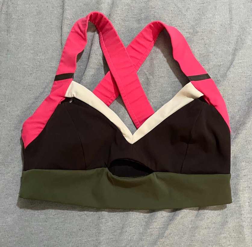 Sırtı çapraz pembe askılı, koyu renk bloklu spor sütyeni. Athleisure ve streetwear tarzına uygun destek sağlar. ️♀️