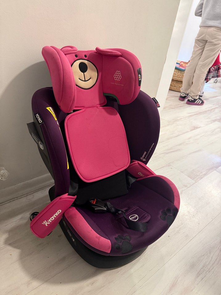 Renkli pembe çocuk oto koltuğu, konfor ve güvenlik için ayı figürlü yastıklı başlık içerir.