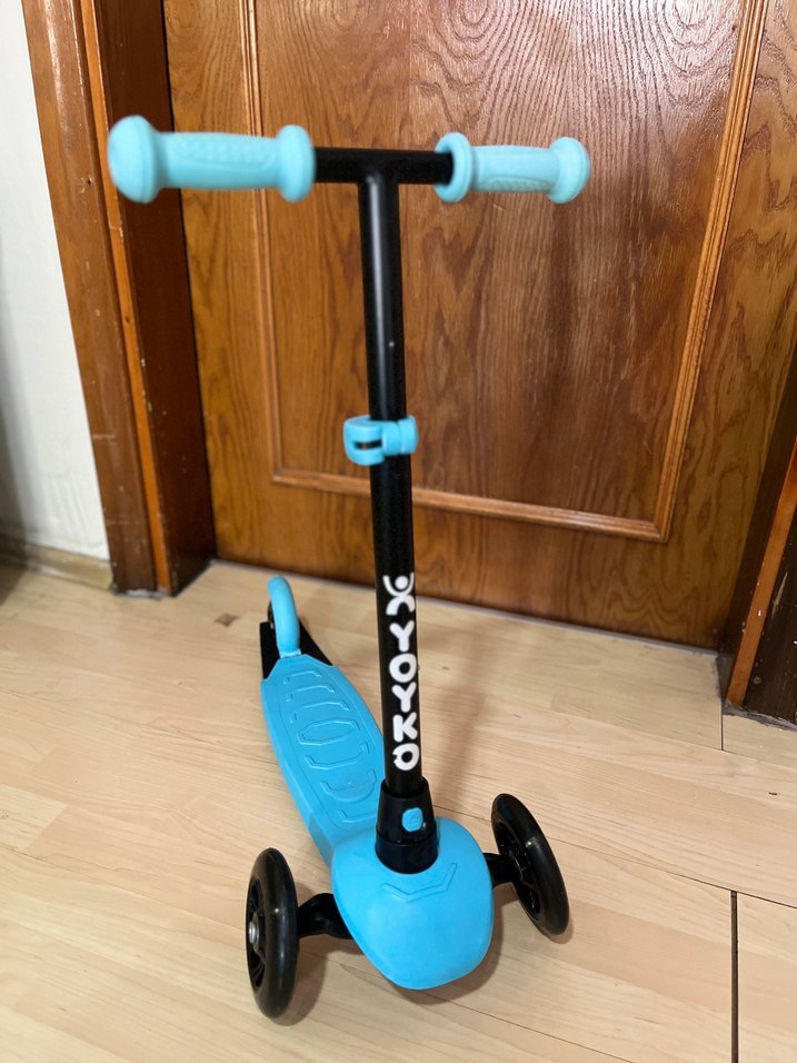 Mavi renkli, sağlam yapılı üç tekerlekli çocuk scooter'ı. Rahat tutma yerleri ve geniş ayak tahtası bulunur. Evde bi kaç kez kullanıldı oğlum sevmedi