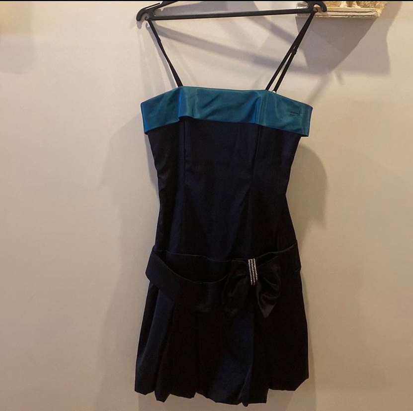 Askılı, mini gece elbisesi, mavi kumaş detayıyla ve kemerli bel kısmıyla fitted kesim sunar. Romantik geceler için uygundur. Iki kez kullandim.. On yuzunde 3 yerde kusuru var (nokta buyuklugunde).. Harika bir elbise.. Alana simdiden hayirli olsun