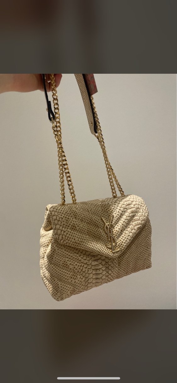 Bej renkli, yılan desenli deri kadın çanta, zincir detayları ve şık YSL logosu ile. Trendy gündelik sokak stili için uygundur.