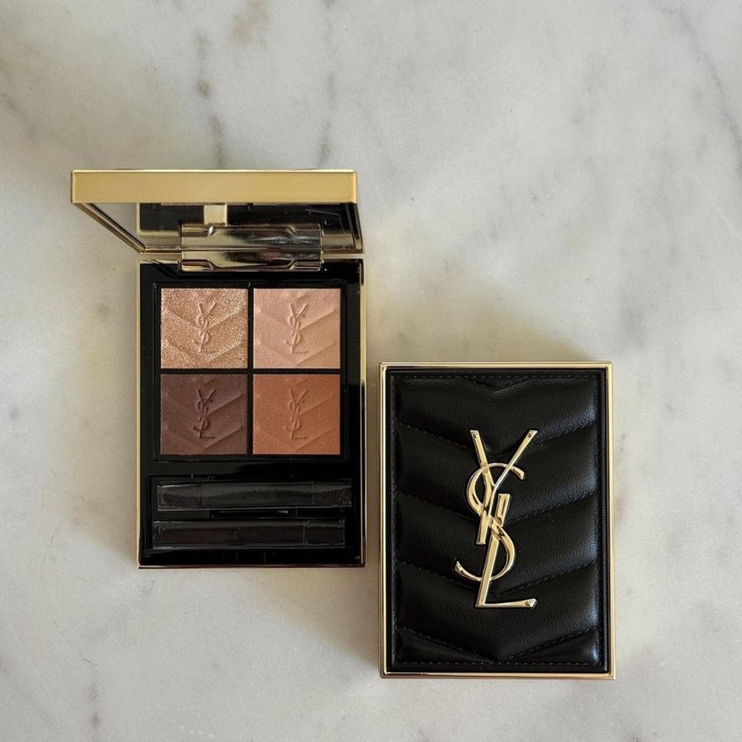 YSL göz farı paleti, dört bej ve kahverengi ton içerir. Şık siyah ve altın renkli kutuda, ayna ve çift aplikatör bulunur.