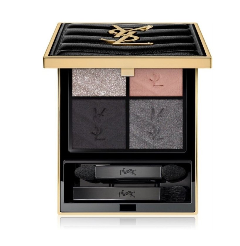 Yves Saint Laurent imzalı, bej ve koyu tonlardan oluşan, mat ve ışıltılı dokulu dört renk göz farı paleti. Her far üzerinde YSL logosu kabartmalı. ✨