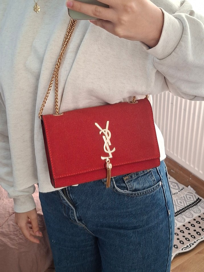 YSL Kırmızı Zincir Detaylı Süet Kadın Çanta