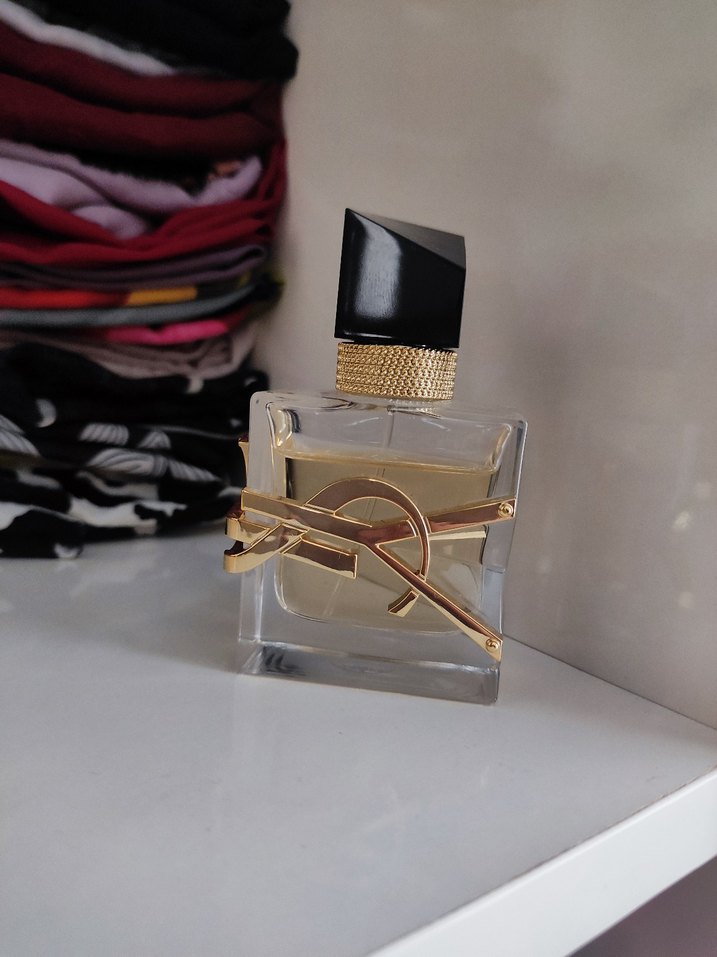 Kadın parfümü, şeffaf cam şişede altın detaylı ve siyah kapaklıdır. Zarif ve şık bir koku sunar.