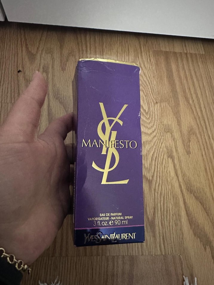 YSL Manifesto kadın parfümü, 90 ml şişede. Doğal spreyli Eau de Parfum. Mor kutuda altın yazılı şık tasarım.