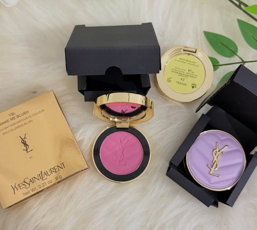 Yumuşak dokulu YSL pembe allık, URENT markalı. Altın tonlu kompakt kutu ve içinde ayna bulunur.