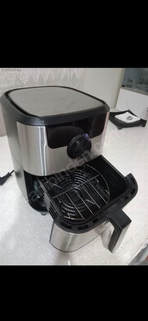 Gri renkte, paslanmaz çelik gövdesi ve ayarlanabilir sıcaklık düğmesi bulunan hava fritözü. Çıkarılabilir sepet ve metal ızgarası bulunur.