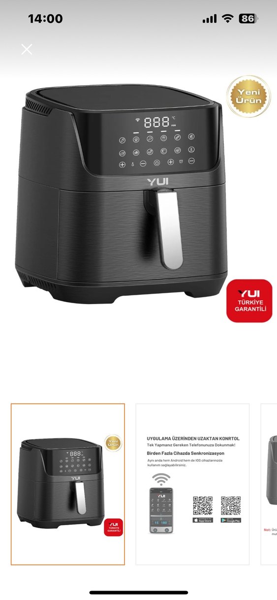 YUI siyah hava fritözü, dokunmatik ekran ve çoklu ön ayarlarla donatılmıştır. Uygulama üzerinden uzaktan kontrol imkanı sağlar. Çok az kullandım. Mutfağım küçük diye satıyorum. İçi tertemiz