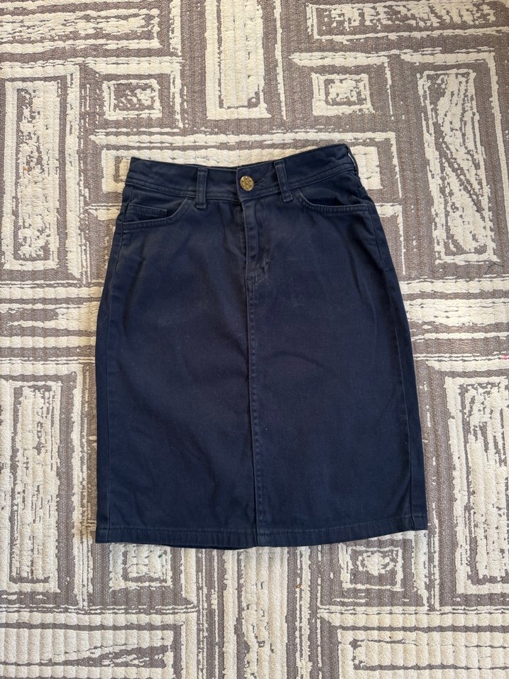 Lacivert mini kot etek • Bel: 64–65 cm • Kalça: 86 cm • Boy: 52 cm • Hiçbir defosu yok, temiz kullanıldı • Arka yırtmaç detayı ile rahat hareket imkânı • Klasik 5 cepli model • Rengi soluk değil, koyu lacivert ilk fotoğraflardaki gibi