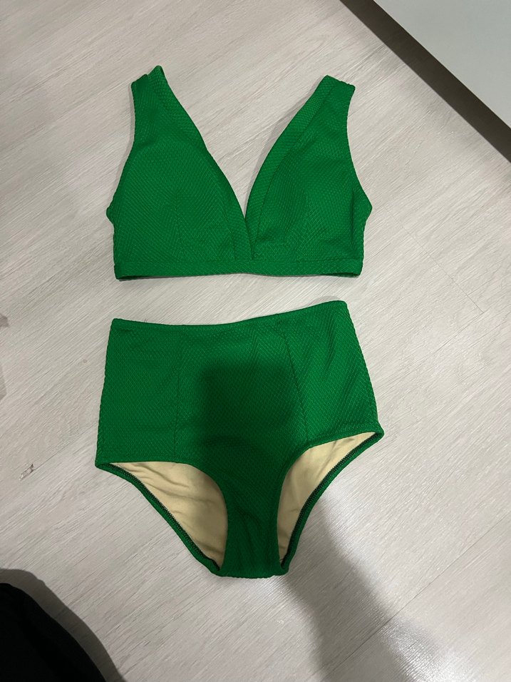 Straplı üst ve yüksek bel alt parçalı, sade ve şık yeşil bikini takımıdır. Plajda modern ve rahat bir tarz sunar.