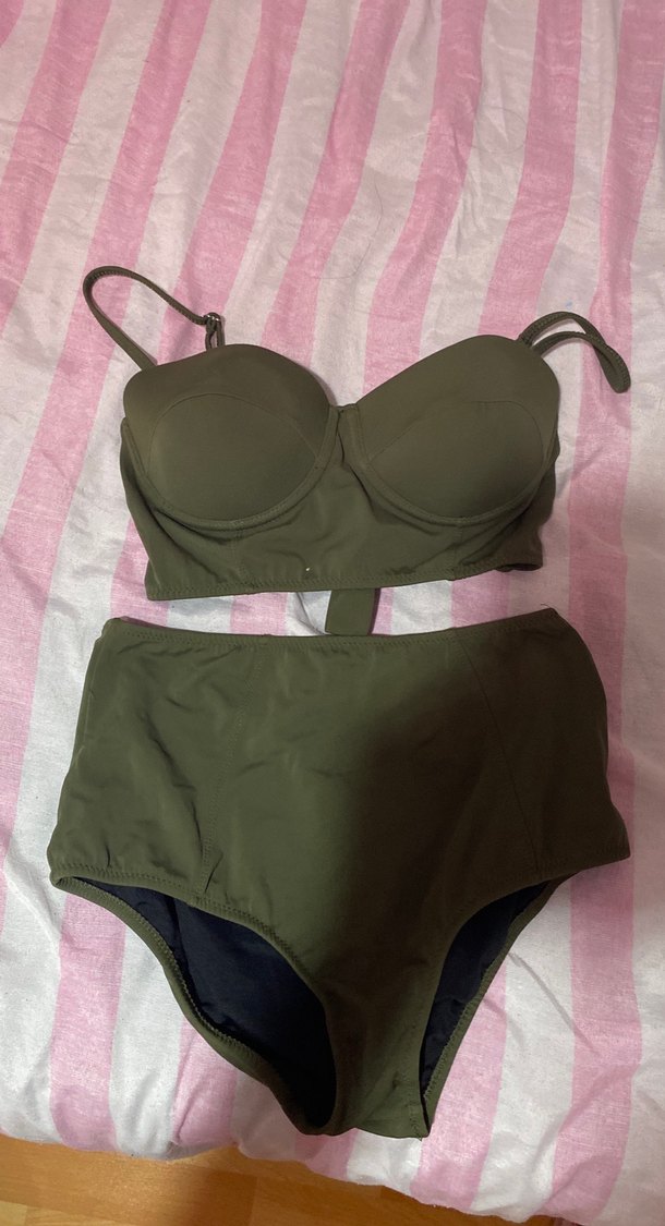 Haki renk, ayarlanabilir askılı ve yüksek bel detaylı minimal kadın bikini takımı, plajda şık ve rahat kullanım sağlar.