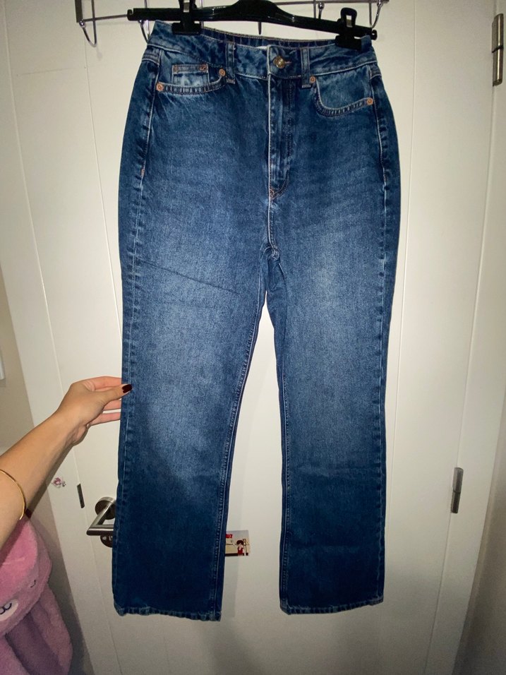 Düğmeli önde, düzenli kesim lacivert kot pantolon. Çok rahat bir kot 36-38 arası giyenlere güzel olur . 165-172 arası boya uygun bence paca boyu