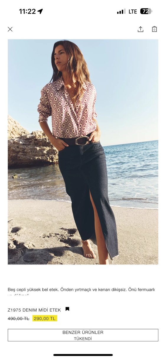 Bu uzun kot etek, yüksek bel ve beş cep detayına sahiptir. Önde yırtmaç ve dikişsiz kenarlarla, ön fermuarlıdır. Kemerlidir.