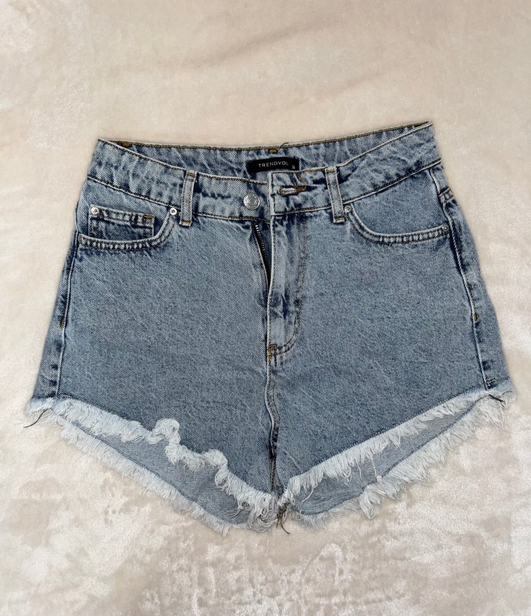 Kadınlar için yüksek bel, bol kesim kot şort. Kısa ve mini uzunlukta, yıpranmış kenar detaylarıyla günlük rahat sokak stili sunar.