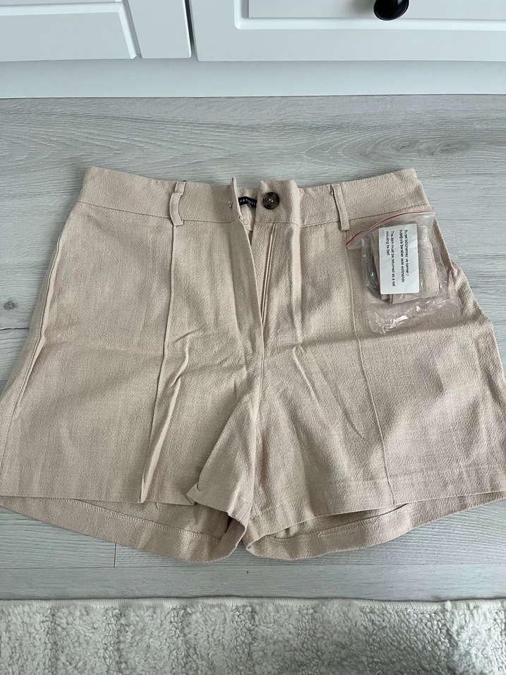 Bej renkli yüksek bel keten şort, rahat kesimi ve kısa boyuyla günlük sokak stiline uygundur. Desensiz, şık ve rahat bir görünüme sahiptir.