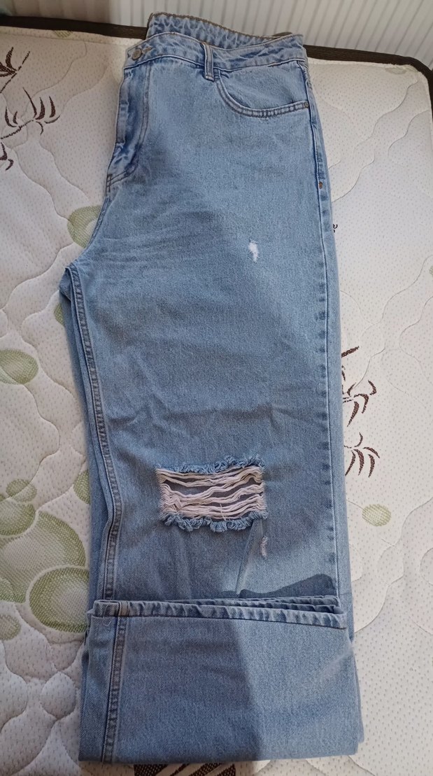 Buz mavi, yüksek bel, yırtık, geniş paça kot pantolon. 1-2 kere giyildi ve terzi işlemi gördü. Boy 110 cm, bel 50 cmdir. Bedenine göre bir tık dar kalıp ve kumaşı pek esnemiyor. Pazarlık payı vardır.