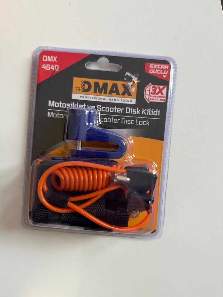 Turuncu renkli DMAX motosiklet ve scooter disk kilidi, ekstra güçlü koruma ve spiral kablo ile birlikte gelir. 110 desibelli, Hatırlatıcı kablolu. yüksek desibel disk kilidi, kapalı kutu, güvenlik sertifikalı. Sıfır