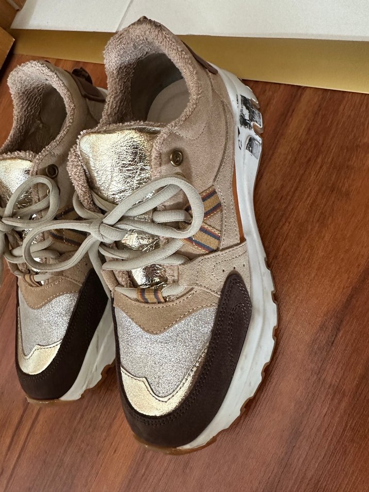Kahverengi süet malzemeden, dolgu topuklu ve bağcıklı kadın spor ayakkabısı. Yılan desenli detaylar ve günlük sokak stili için uygun.