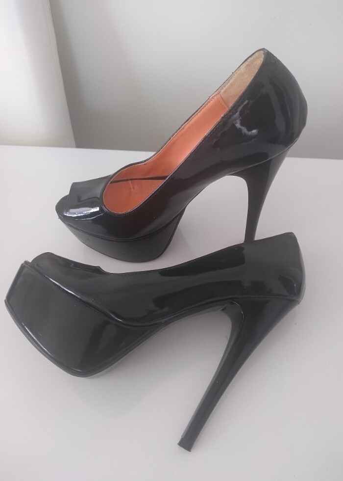 Topuklu rugan ayakkabı topuk boyu 14 cm birkac kez giydim uç kısmında hafir bir pürüz var resimlere ekledim