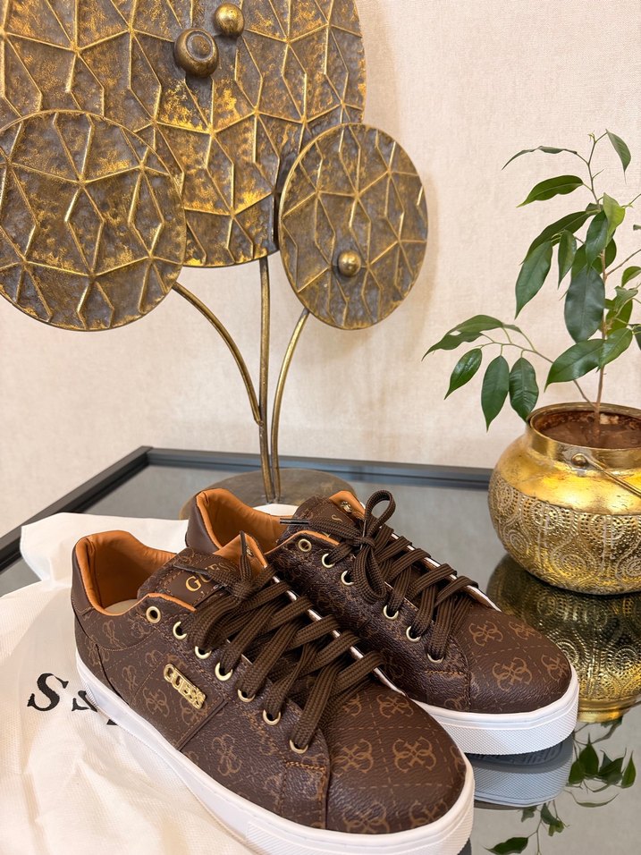 Kahverengi deri, koyu yılan desenli ve tokalı detaylı yüksek topuklu spor ayakkabılar, günlük kullanıma uygun sokak tarzı sunar. Guess ayakkabı a kalite