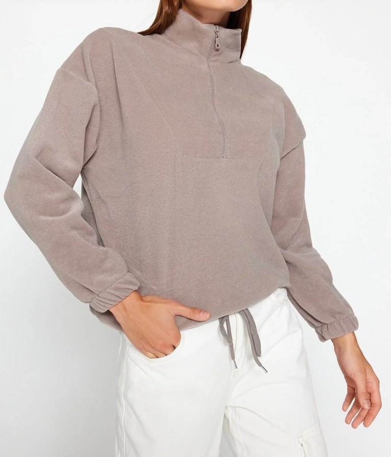 Yüksek yakalı, uzun kollu ve bol kesim bej sweatshirt, yumuşak ve sıcak kumaştan üretilmiştir. Günlük sokak stili için rahat ve şık bir tercih.