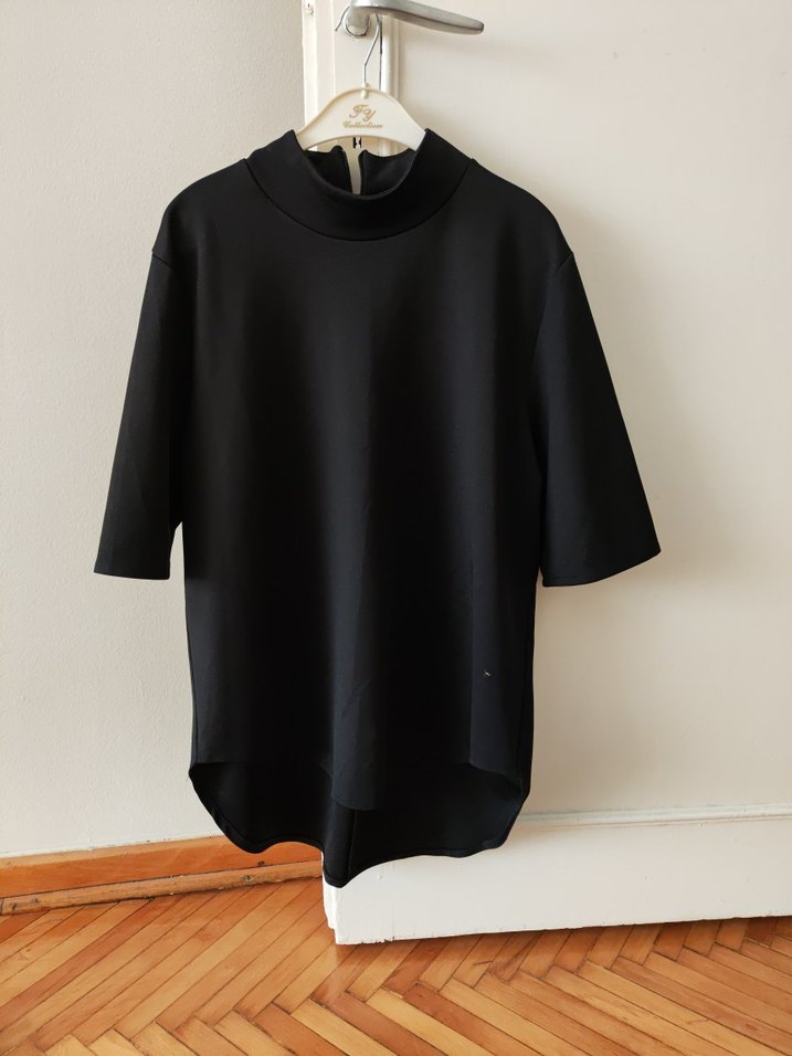 Yüksek yakalı, kısa kollu ve bol kesim siyah tişörtü. Yumuşak ve sıcak kumaştan, midi boyda, minimalist ve şık tasarım.