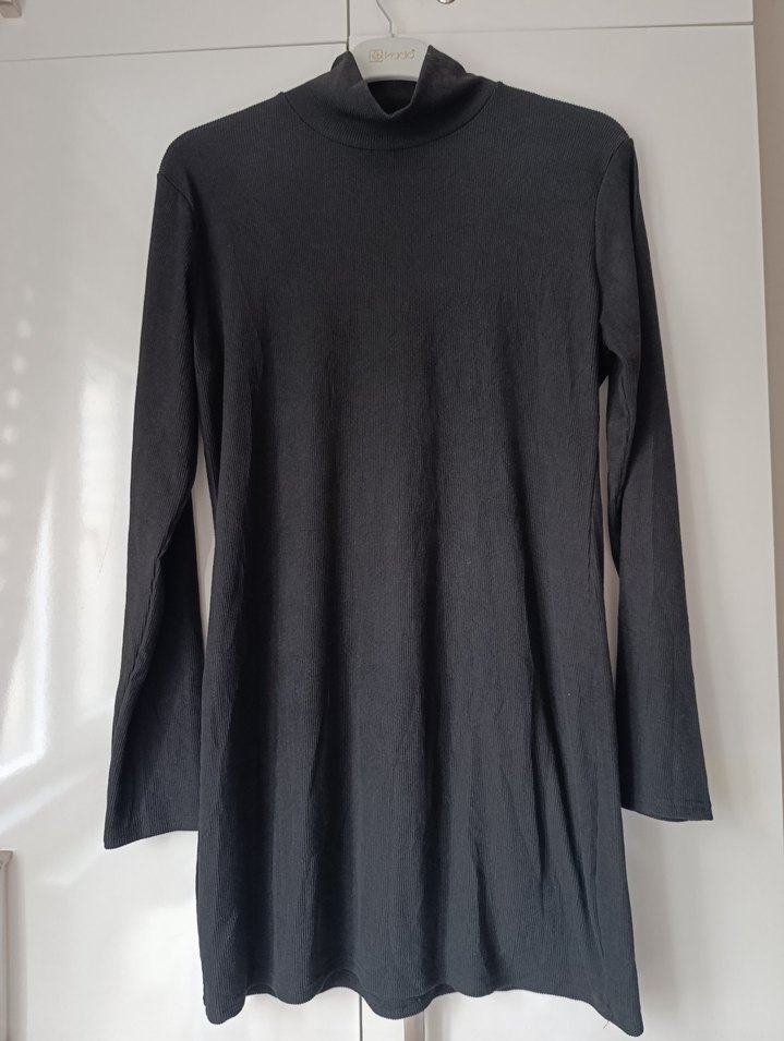 Yumuşak keten kumaştan, yüksek yakalı ve uzun kollu siyah elbise. Minimalist ve desensiz tasarımı günlük kullanıma uygun gotik tarzda.