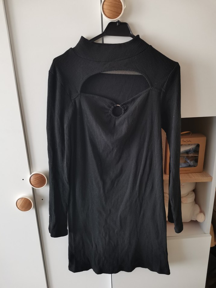 Yüksek yakalı, uzun kollu, sıkı kesim siyah triko elbise, midi boyda ve halka detaylı yırtmaçlıdır. Sentetik kumaştan yapılmış, gotik tarzda gündelik kullanıma uygundur.