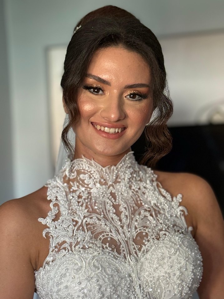 Bu vücuda oturan balık kesim gelinlik, yüksek yakalı ve detaylı boncuk işçiliğine sahip. Kolsuz ve midi boyda, bohem stil ile klasik zarafeti birleştirir.