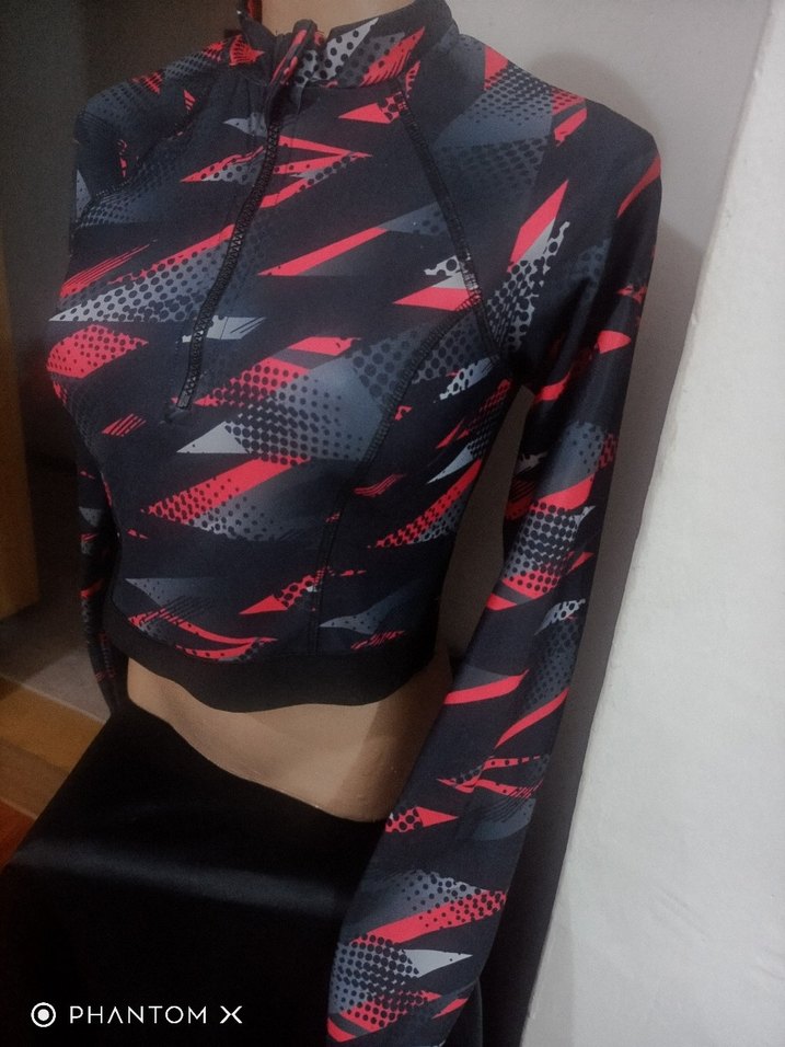 Dar kesim, uzun kollu ve yüksek yakalı kadın crop top. Canlı baskılı deseni ve ön fermuarı ile sentetik kumaştan üretilmiştir. Spor ve sokak stiline uygun.