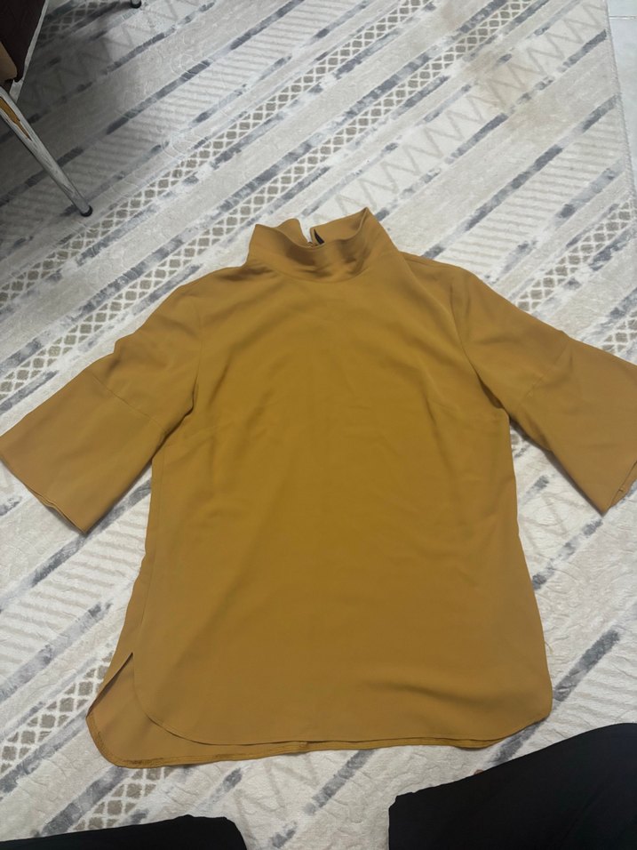 Yüksek yakalı ve kısa kollu, bol kesimli bej kadın gömleği. Parlak ve yumuşak kumaştan, günlük rahat kullanım için uygun midi uzunlukta. ✨