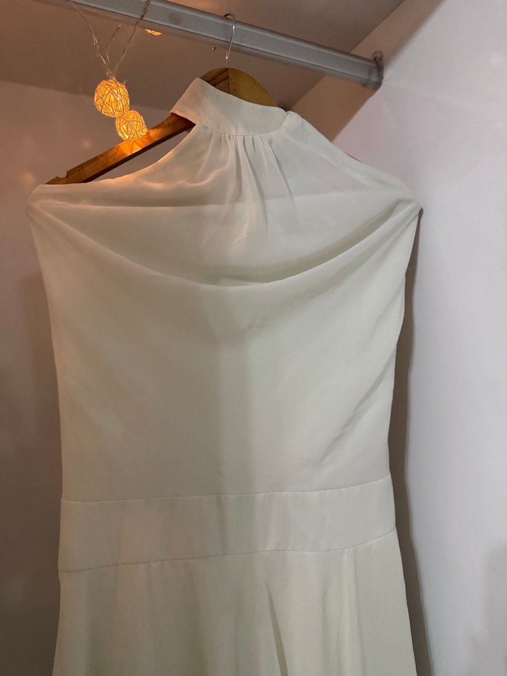Yüksek yakalı, kolsuz beyaz , bol kesim ve uzun boy ile minimalist bohem tarzı yansıtıyor. Modaya uygun ve sade bir şıklık sunar.