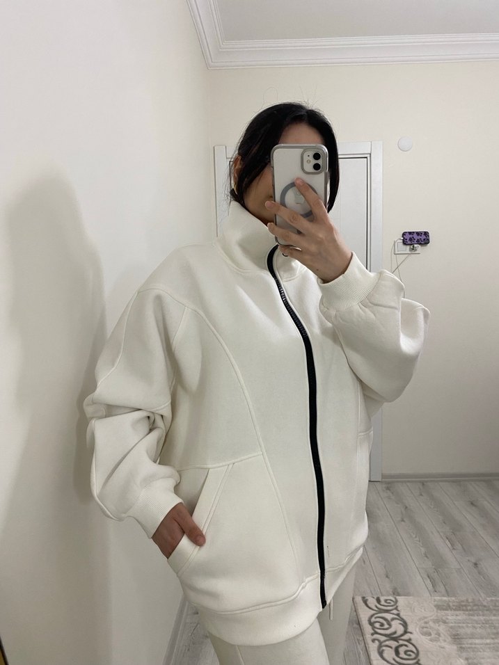 Yüksek yakalı, fermuarlı, yumuşak ve sıcak kumaştan yapılmış bol kesim uzun kollu beyaz kadın ceket. Rahat ve günlük kullanıma uygun midi boyda.