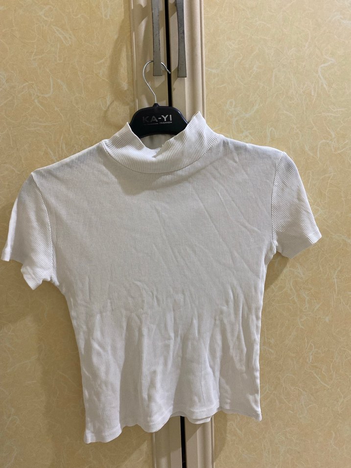 Yüksek yakalı, kısa kollu ve pamuklu kumaştan yapılmış beyaz, dar kesim kadın tişörtü. Günlük kullanım ve sokak stiline uygundur, sade ve şık bir görünüm sunar.