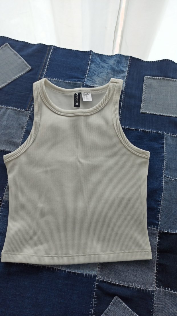 Yüksek yakalı, kolsuz ve vücuda oturan kadın atlet. Yumuşak kumaştan yapılmış, günlük sokak stiline uygun sade beyaz tasarım.