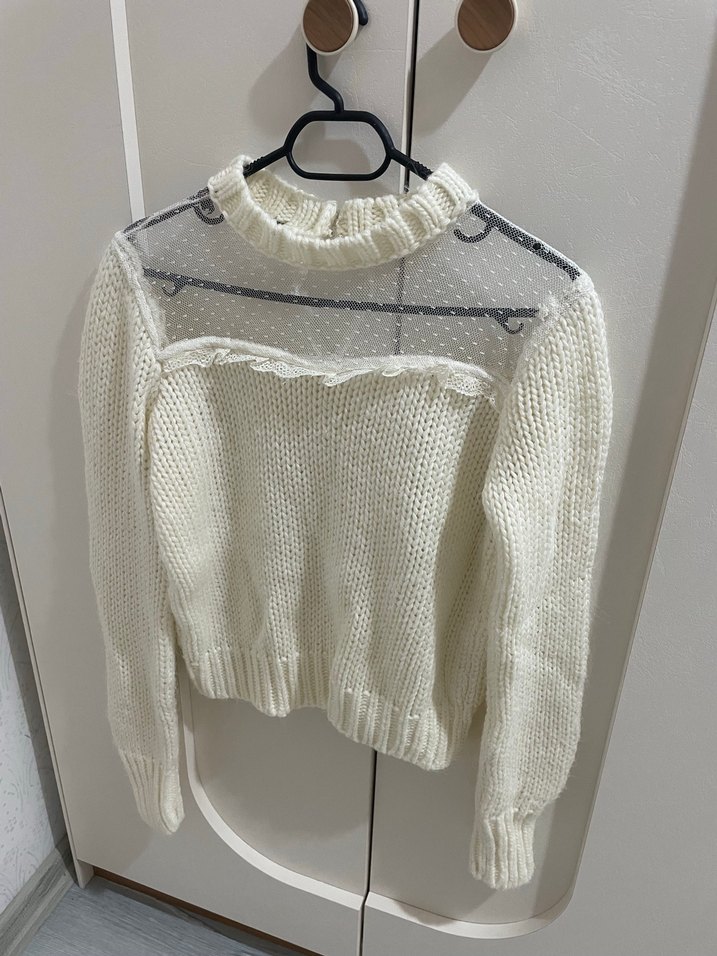Yüksek yakalı, uzun kollu ve vücuda oturan kadın kazak, yumuşak örgü kumaştan yapılmıştır. Üst göğüs kısmında şeffaf puantiyeli tül detayı bulunmaktadır. Günlük kullanıma uygundur.