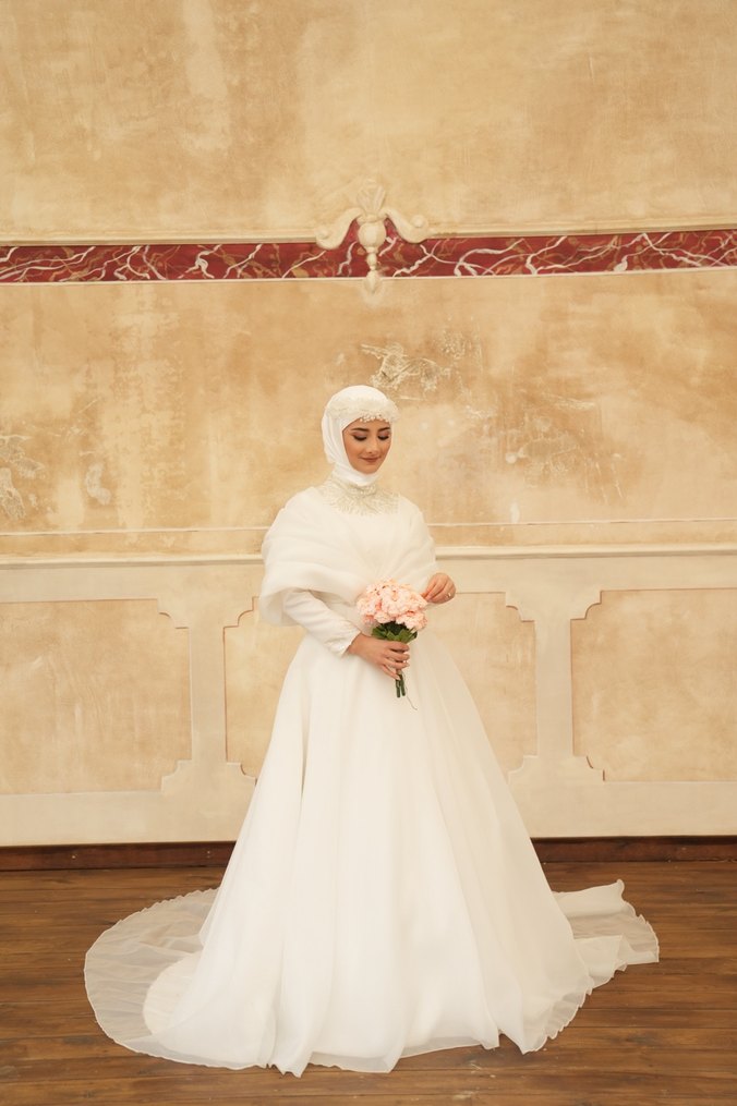 Yüksek Yakalı Beyaz Tesettür Nişan Elbisesi