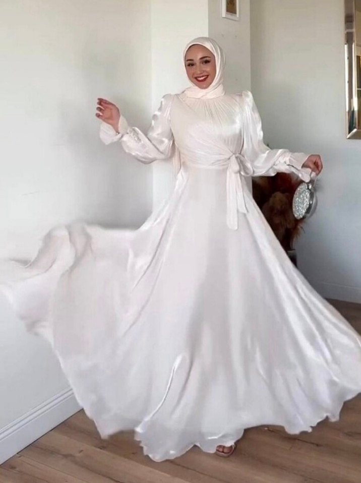 Yüksek yakalı, beyaz uzun abiye elbise, salaş kesim ve drapeli detaylarla, mütevazı ve göz alıcı bir gelinlik tarzı sunar. İnce askılı kollu ve klasik tasarımlıdır. nihak içinde uygundur.