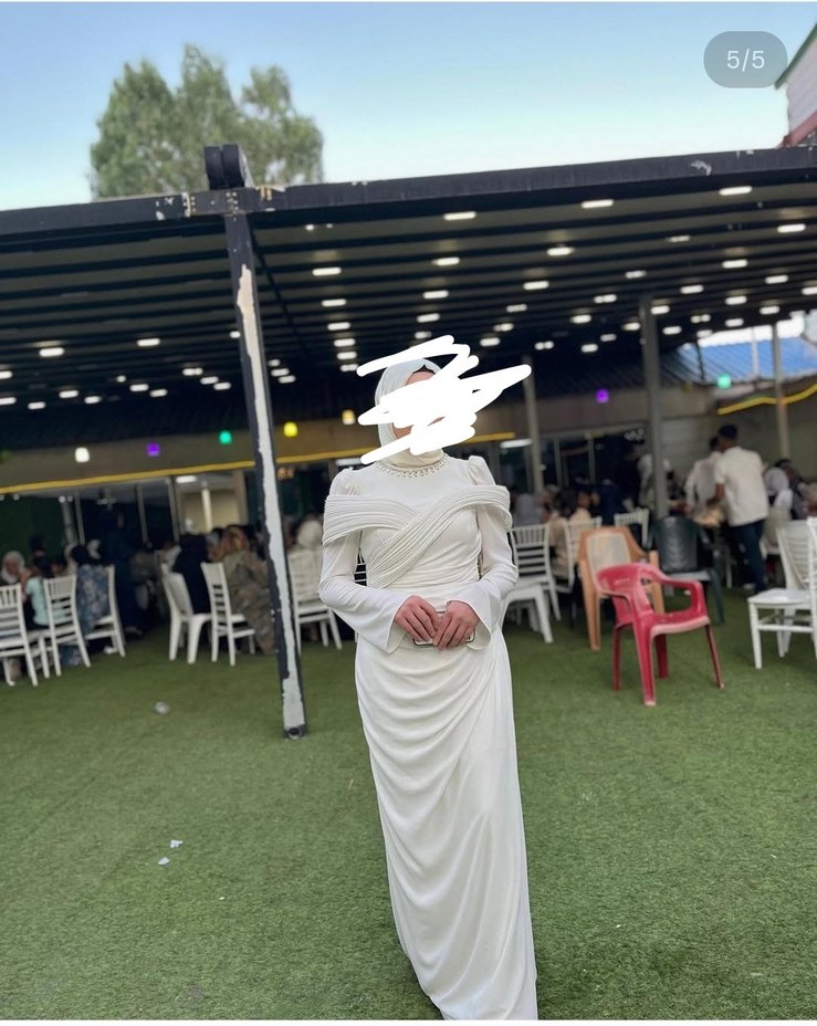 Yüksek yakalı, uzun boylu, beyaz renkli, düz kesim ve ince askılı gelinlik, sade ve modern bir görünüm sunar.