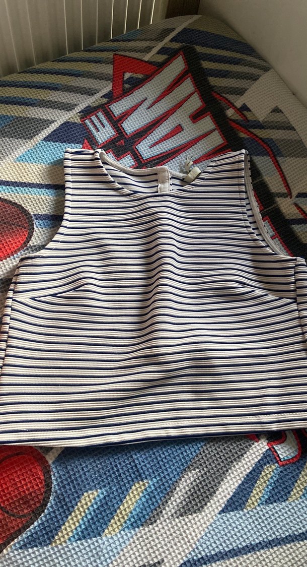 Yüksek yakalı, kolsuz ve ince çizgili beyaz-gri kadın atlet, normal midi boyda ve hafif pileli dokuyla, günlük sokak stili için uygundur.