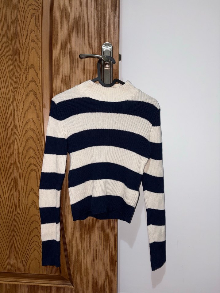 Yüksek yakalı, uzun kollu ve çizgili desenli, vücuda oturan triko kazak. Normal midi uzunluğunda, rahat sokak stili için uygun.