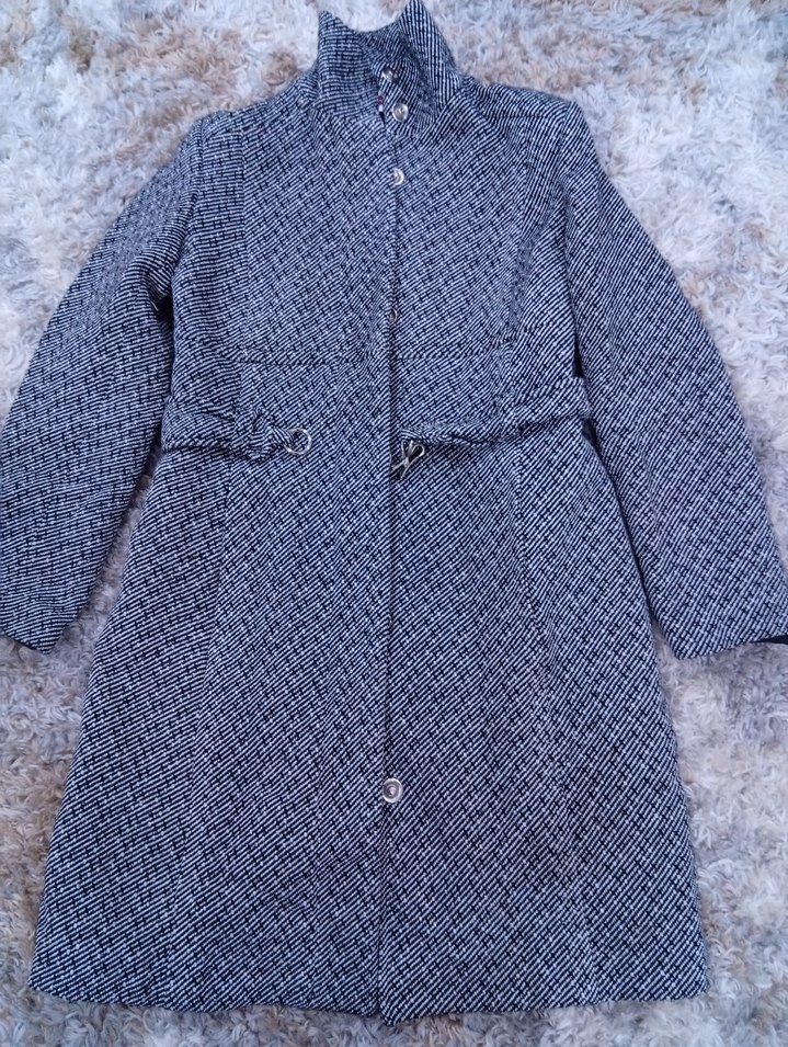 Yüksek yakalı ve desenli kumaştan yapılmış, bel detaylı uzun kollu kaban. Düğme kapamalı ve şık görünümlüdür.