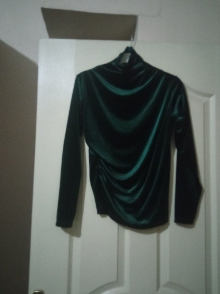 Yumuşak sentetik kumaştan yapılmış, yüksek yakalı ve uzun kollu, drapeli kesime sahip yeşil renkli dar kesim kadın bluz. Parti için uygun, gotik ve avangart tarzda.