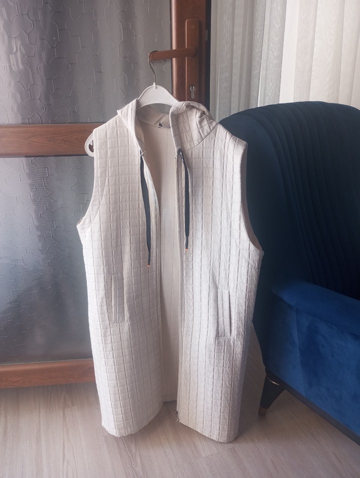 Yüksek yakalı, fermuarlı beyaz keten kolsuz yelek, rahat kesim ve midi boyda, sokak modasına uygun şık bir parça.