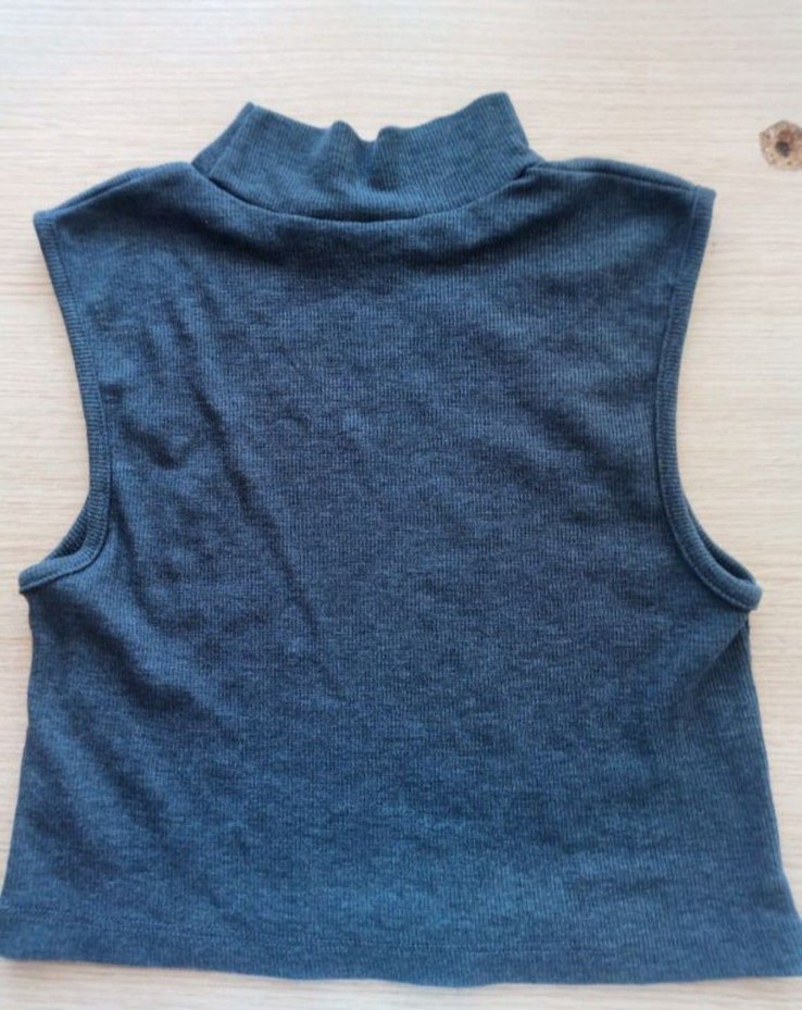 yüksek yakalı, kolsuz denim kadın atlet. Lacivert gri renkte, dar kesim ve günlük rahat stil için uygun.