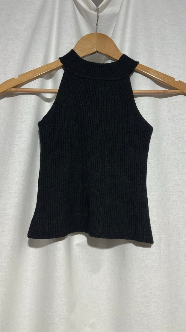 Yüksek yakalı, siyah renkli, örme kumaştan yapılmış, kolsuz ve vücuda oturan kadın triko bluz. İç kısmında minik bir acilmasi vardı onu dikmiştim. Küçük ve İçte kaldığı için görünmüyor bile. Marka temsilidir.