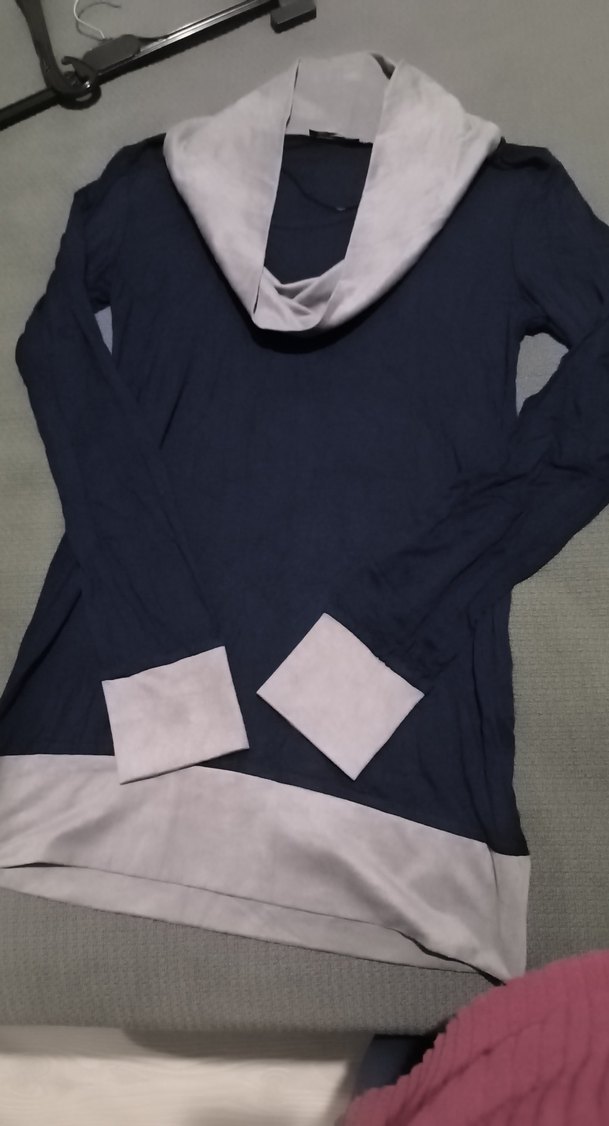 Yüksek yakalı ve uzun kollu, lacivert tonlarda bej detaylı, fitted hamile bluzu. Yumuşak sentetik kumaştan günlük kullanıma uygun şık ve rahat. kahverengi detaylar çok güzel kaliteli yumuşak deri depo ürünüdür çok kilolu olmasa M bedene de uygun