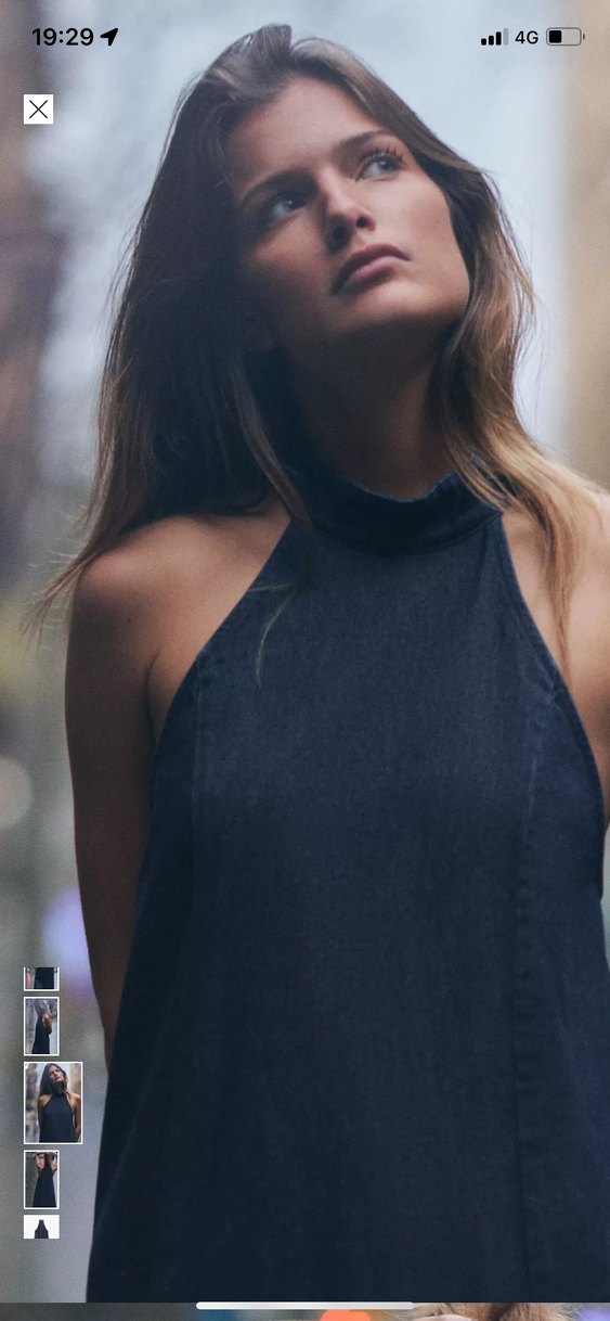 Yüksek yakalı, kolsuz lacivert denim elbise, bol kesim ve drapeli detaylara sahiptir. Midi boy ve minimalist tasarımıyla günlük sokak stiline uygundur.
