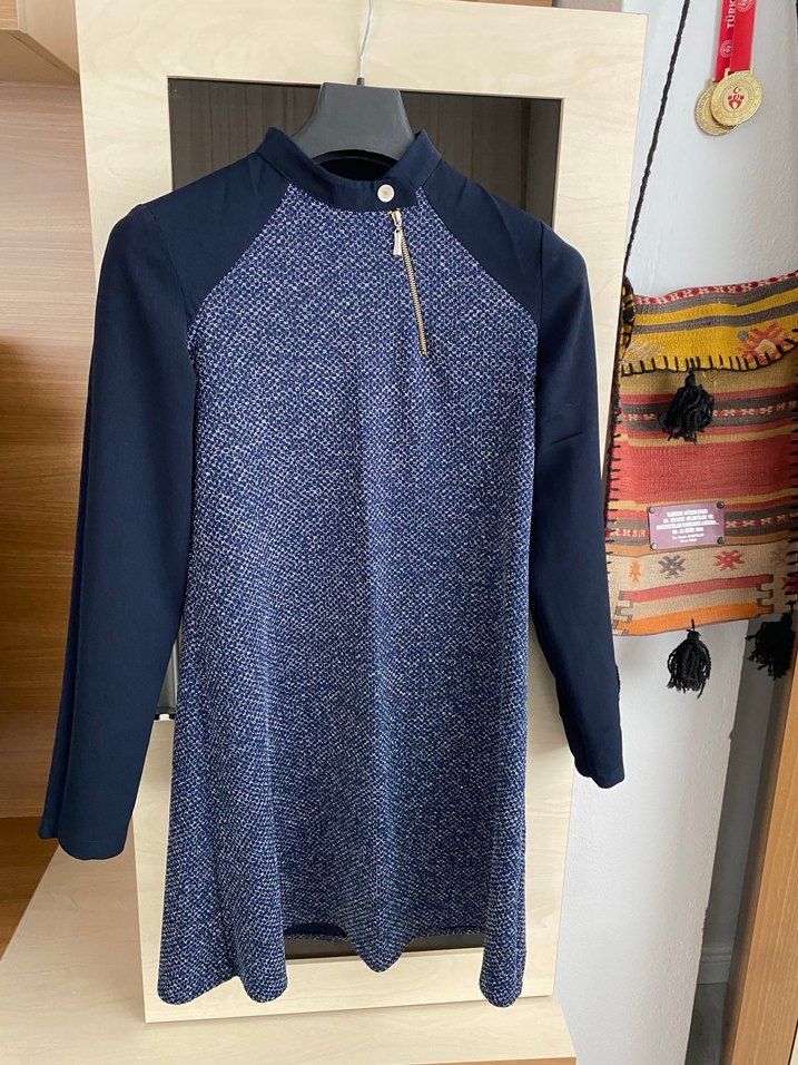Yüksek yakalı, uzun kollu ve fitted kesime sahip midi boy mavi gri tonlarında desenli sentetik kumaştan tunik. Fermuar detaylı, günlük ve iş stiline uygun.